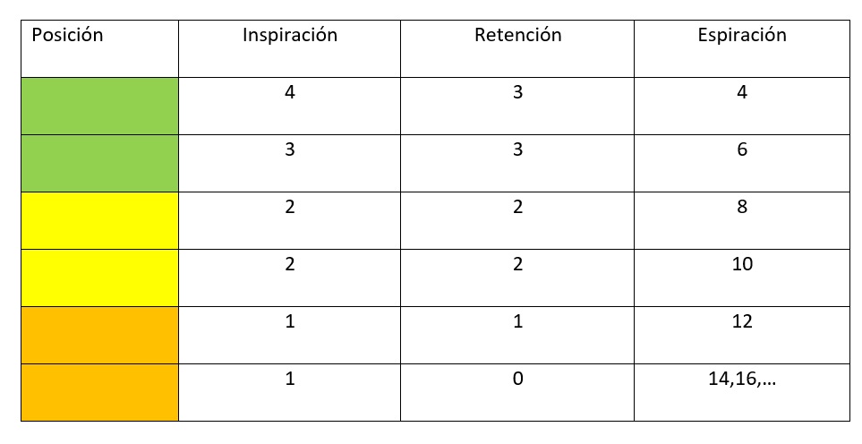 Los ejercicios se pueden practicar libremente en cuanto a los tiempos de inspiración y espiración, aunque aconsejamos aumentar el número de pulsos de la espiración conforme a la siguiente tabla.